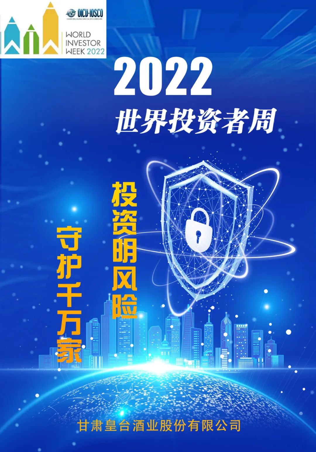 2022年10月8日-14日為“2022年世界投資者周”,本次活動主題為“投資明風(fēng)險(xiǎn),守護(hù)千萬家”。為貫徹落實(shí)監(jiān)管部門投資者保護(hù)工作的部署要求,加強(qiáng)投資者教育保護(hù)的國際交流合作,積極響應(yīng)“2022年世界投資者周”活動號召,皇臺酒業(yè)在監(jiān)管部門的指導(dǎo)下,將以“投資明風(fēng)險(xiǎn),守護(hù)千萬家”為主題,開展投資者教育和保護(hù)宣傳,面向投資者做好證券基金期貨知識宣傳普及,引導(dǎo)投資者學(xué)習(xí)金融知識,樹立正確投資理念!